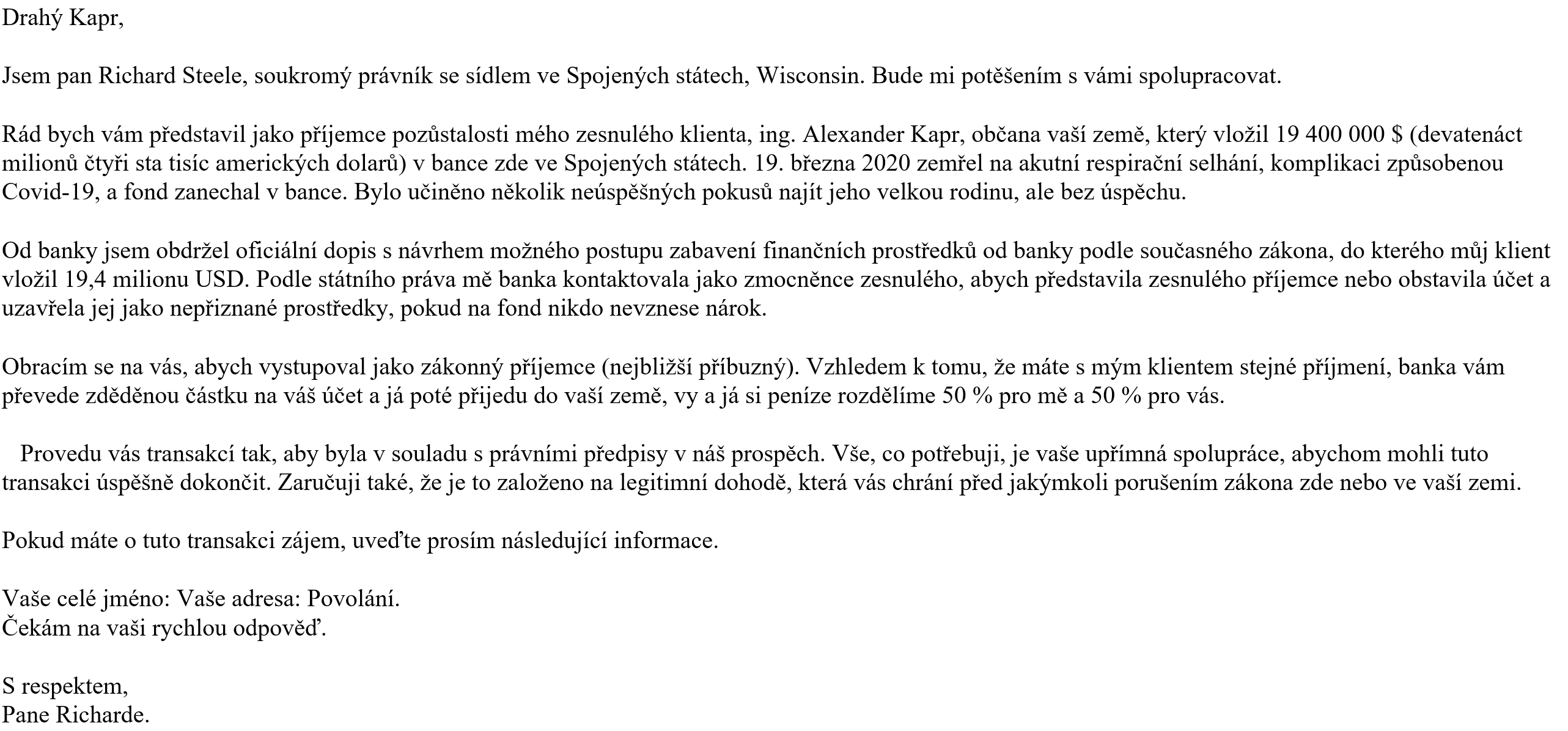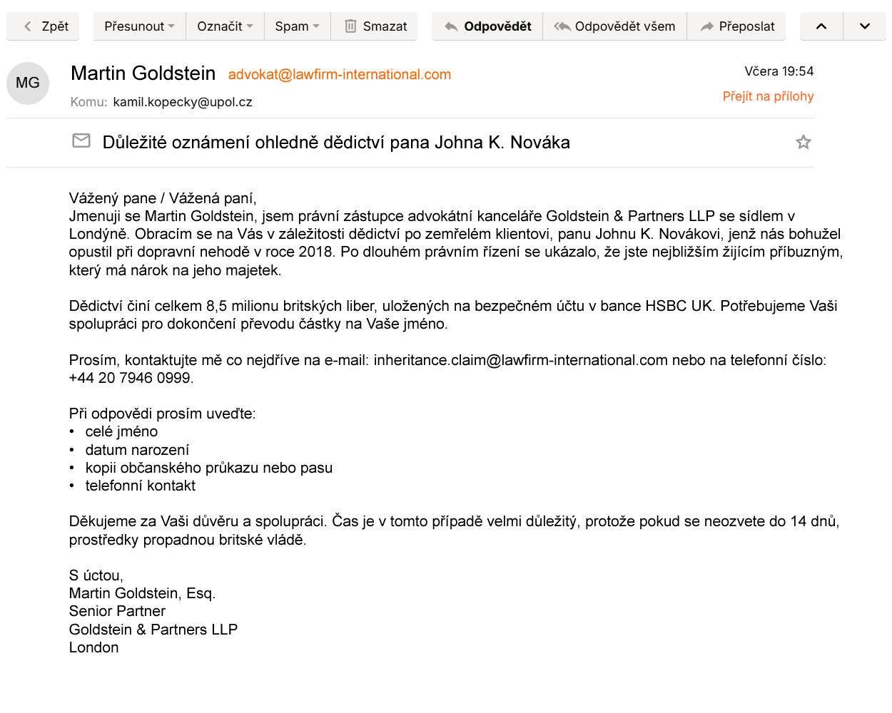 Mladý muž z Olomouce přijal na Facebooku žádost o přátelství od neznámé ženy. Po dvou měsících komunikace mu dotyčná napsala, že je nemocná a nemá žádného dědice. Zmínila se o částce 248 tisíc euro a odkázala ho na svého notáře, který s ním dědictví bude řešit. Poškozenému se zanedlouho ozval údajný notář, který pod legendou převodu peněz požadoval úhradu různých poplatků. Následně mu tvrdil, že paní zemřela a je nutné vyřešit dědické řízení co nejrychleji. Aby k převodu dědictví došlo, bylo nutné zaplatit další poplatky. Jelikož muž legendě uvěřil, naposílal podvodníkům postupně v přepočtu částku ve výši 77 tisíc korun.